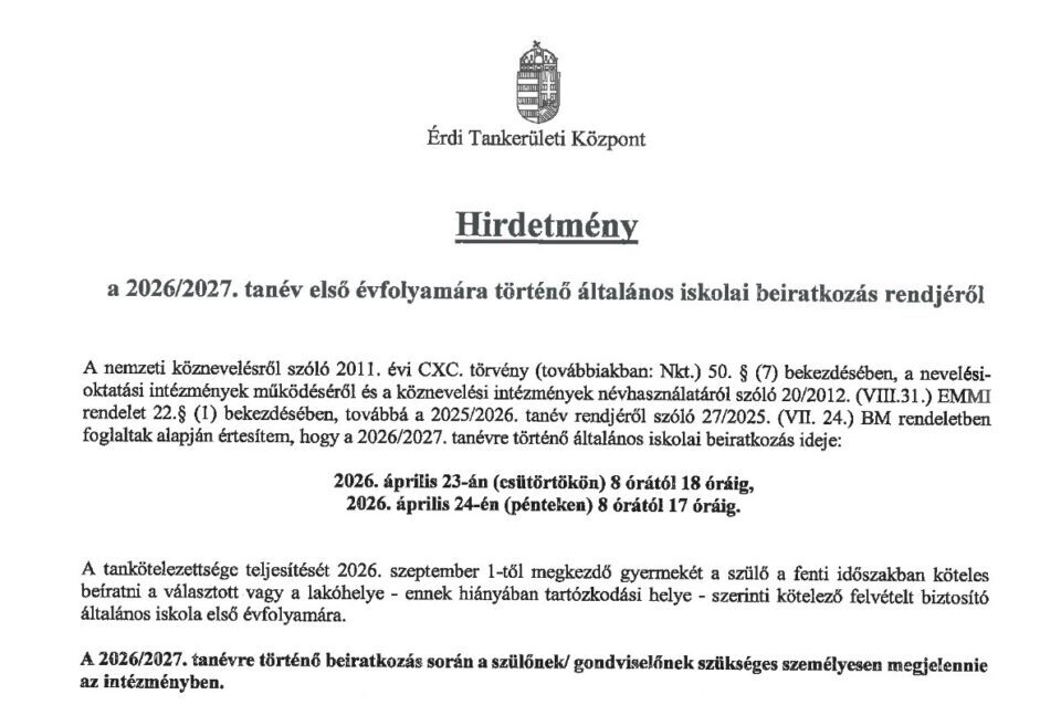 Kedves Szülők! Itt találják a 2026/2027-es tanévre szóló beiratkozási segédletet, a kitöltendő formanyomtatványokat, valamint a biratkozáshoz szükséges dokumentumok listáját! Kérjük, figyelmesen olvassák el a Szülői tájékoztatót! (tovább…)
